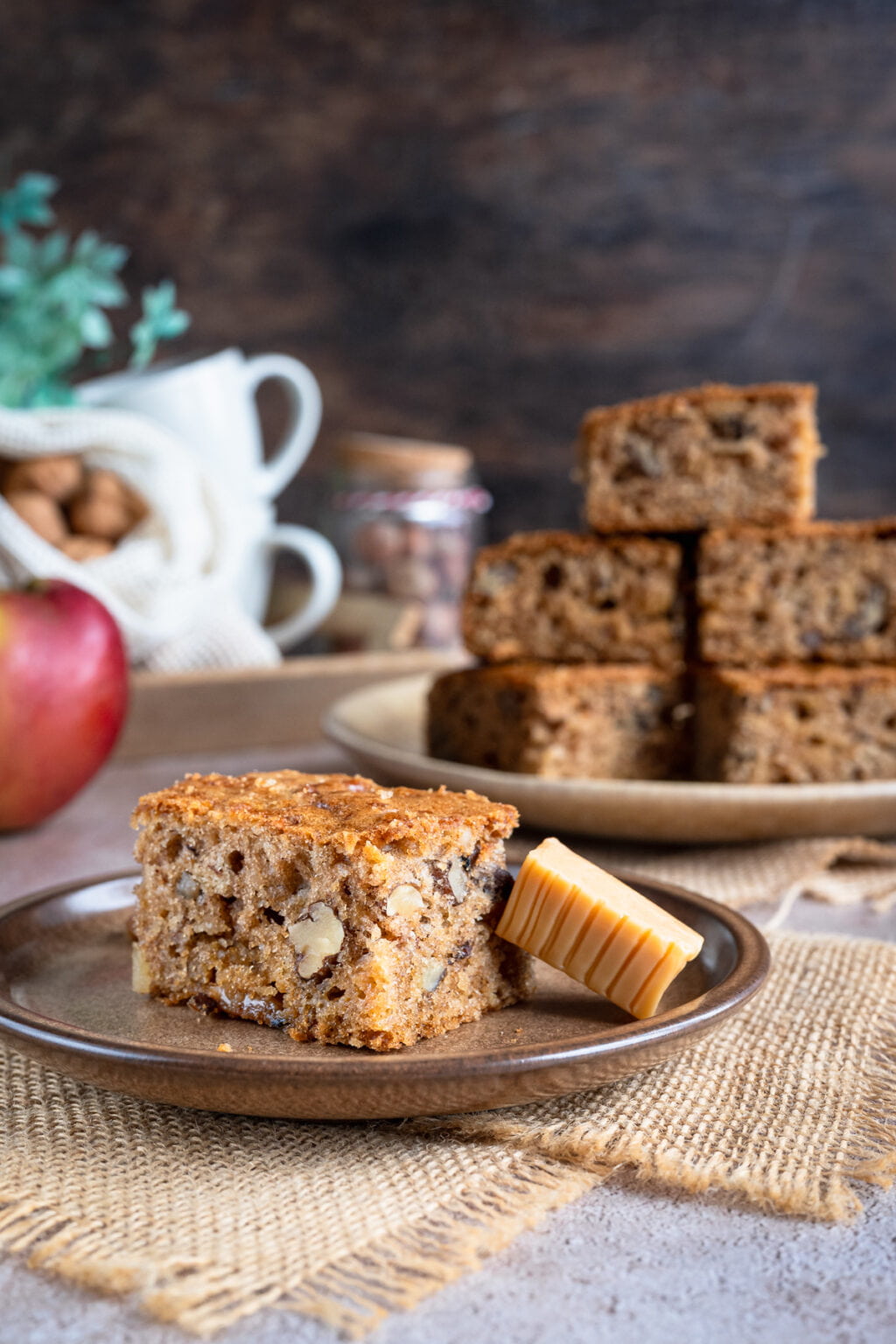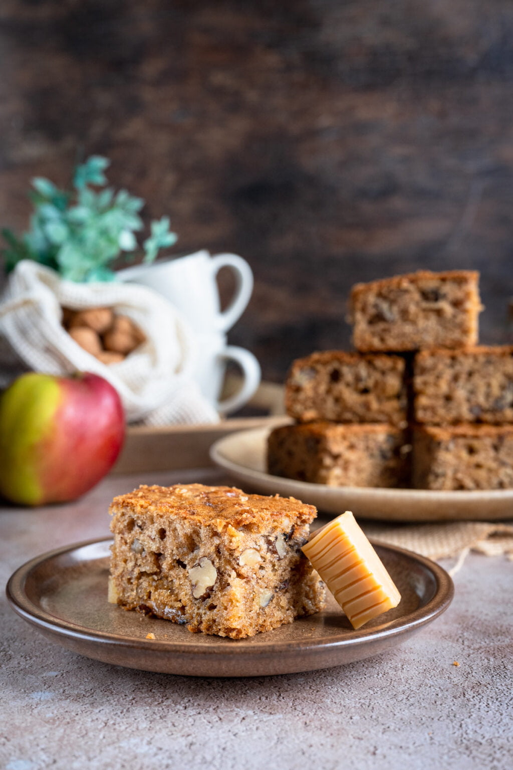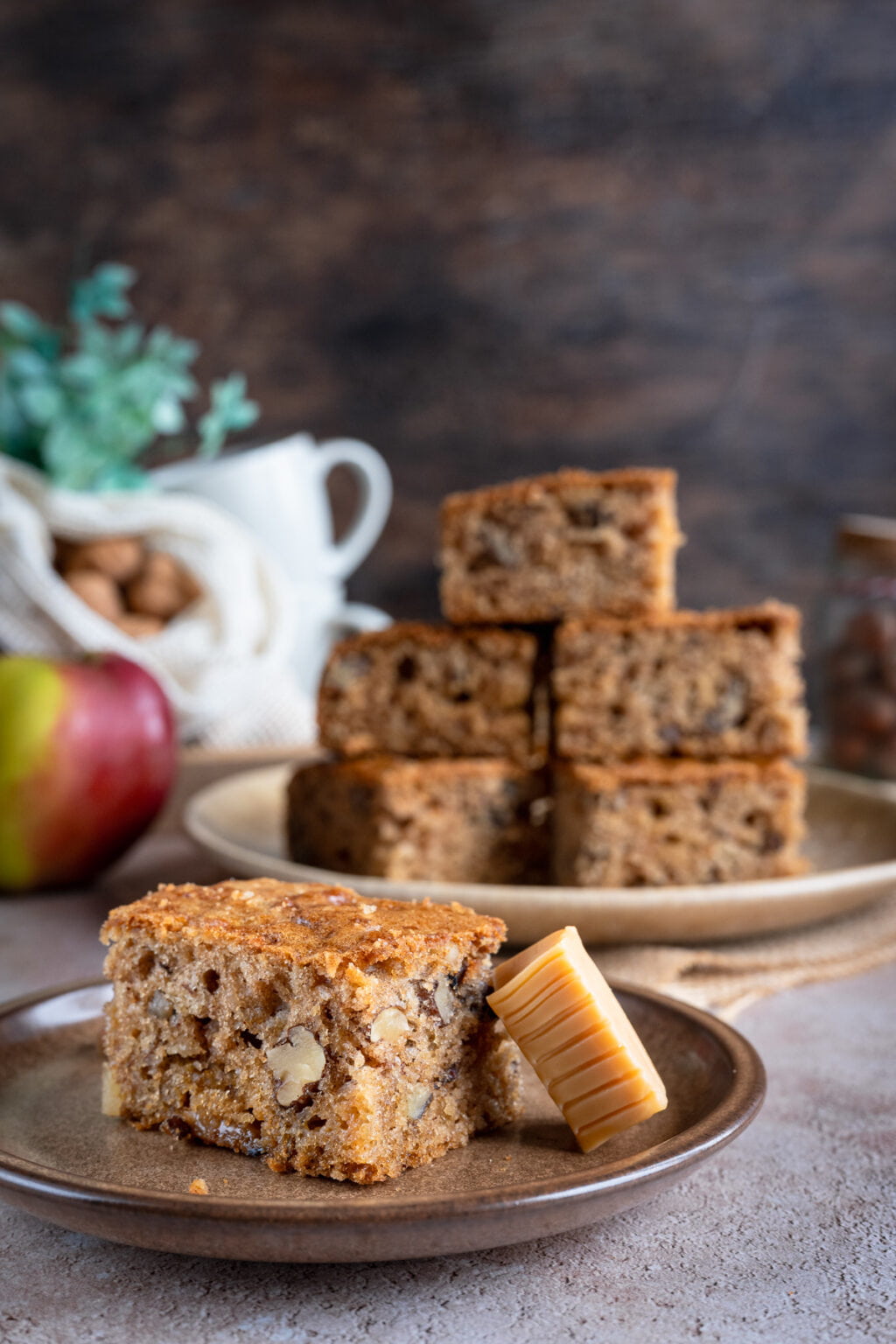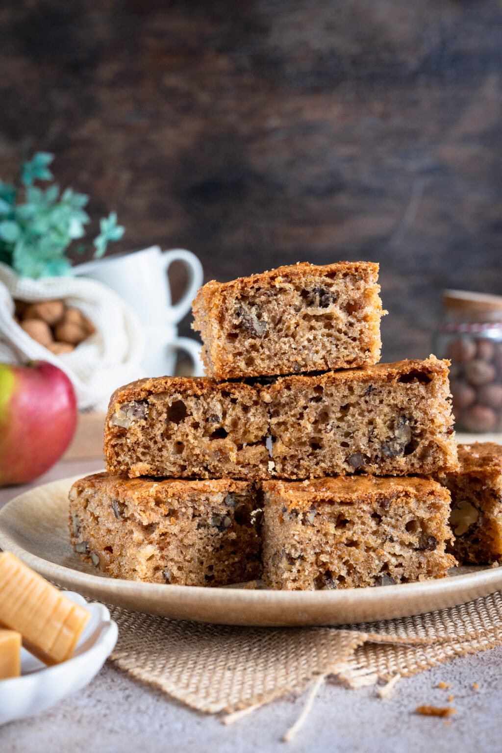 To kolejne ciasto z serii tych, które piekł mój syn, gdy ja nie mogłam działać w kuchni. I powiem szczerze, wyszło na maxa w naszym stylu. Cynamon, lekko karmelowa nuta cukru trzcinowego, jabłka, orzechy i rozpuszczające się krówki… od smaku tego ciasta, wprost nie można się było oderwać. Zniknęło w tempie błyskawicznym i wszyscy stwierdziliśmy, że było najlepszym wypiekiem ostatnich tygodni! Totalnie NASZE smaki.