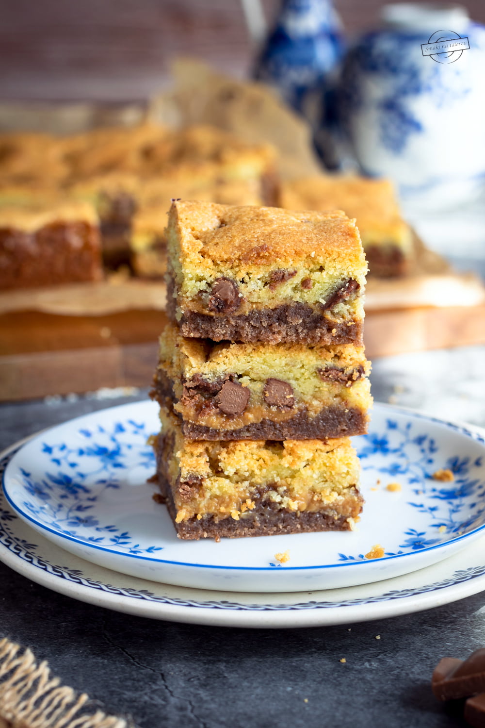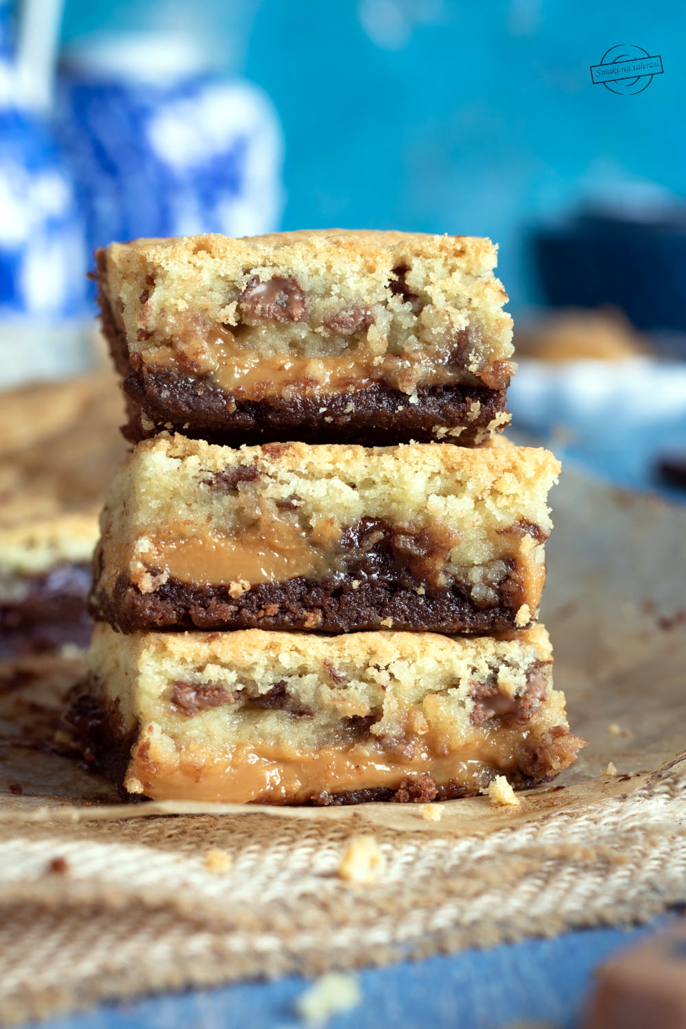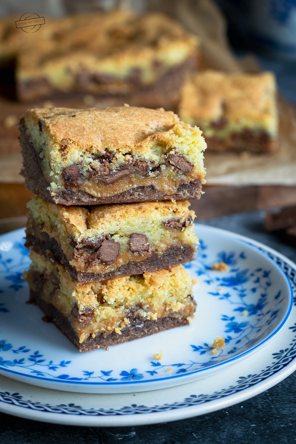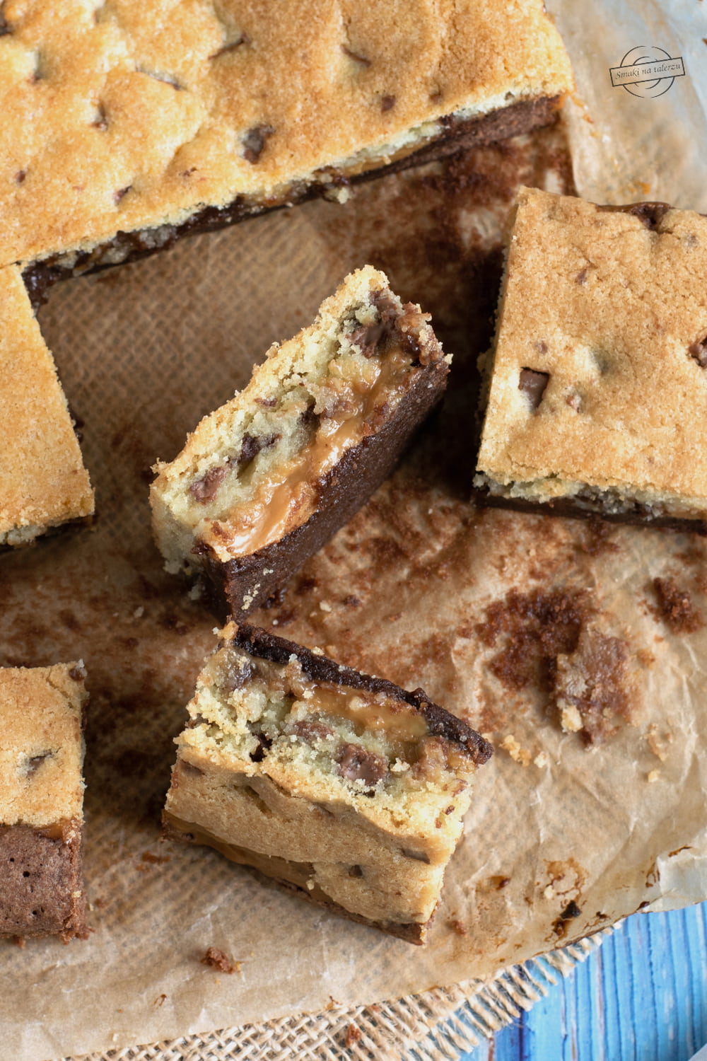 To takie brownie przygotowane na ciemnym kakao z kajmakiem i „ciasteczkową” masą. Do warstwy jasnego ciasta dodajemy kawałki posiekanej czekolady. Cudownie jest na nie trafić, ale uwaga, nie warto przesadzać z ich ilością. Przetestowałam to na własnej skórze, że przy zbyt dużej ilości czekolady, ciasto jest po prostu zbyt słodkie.