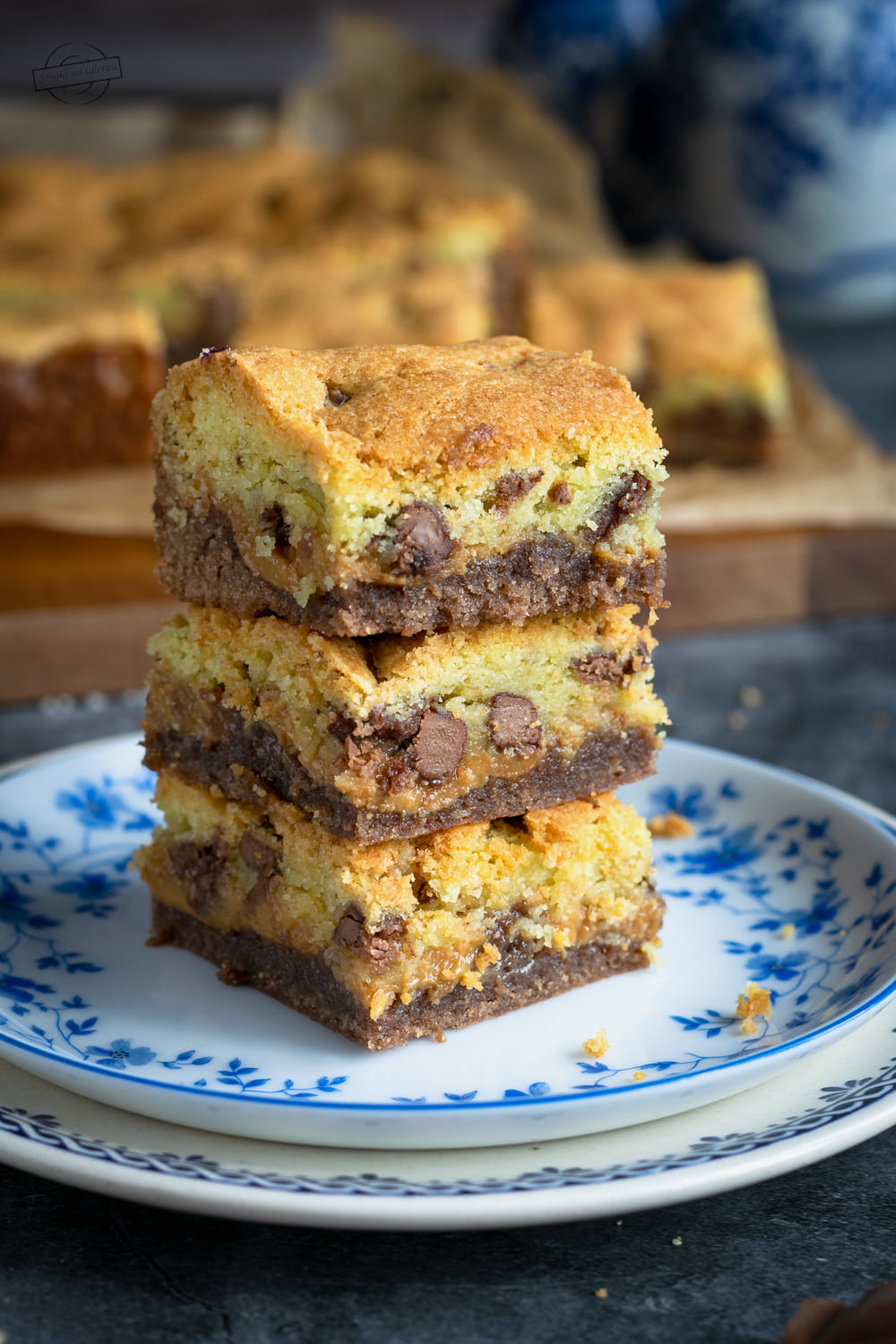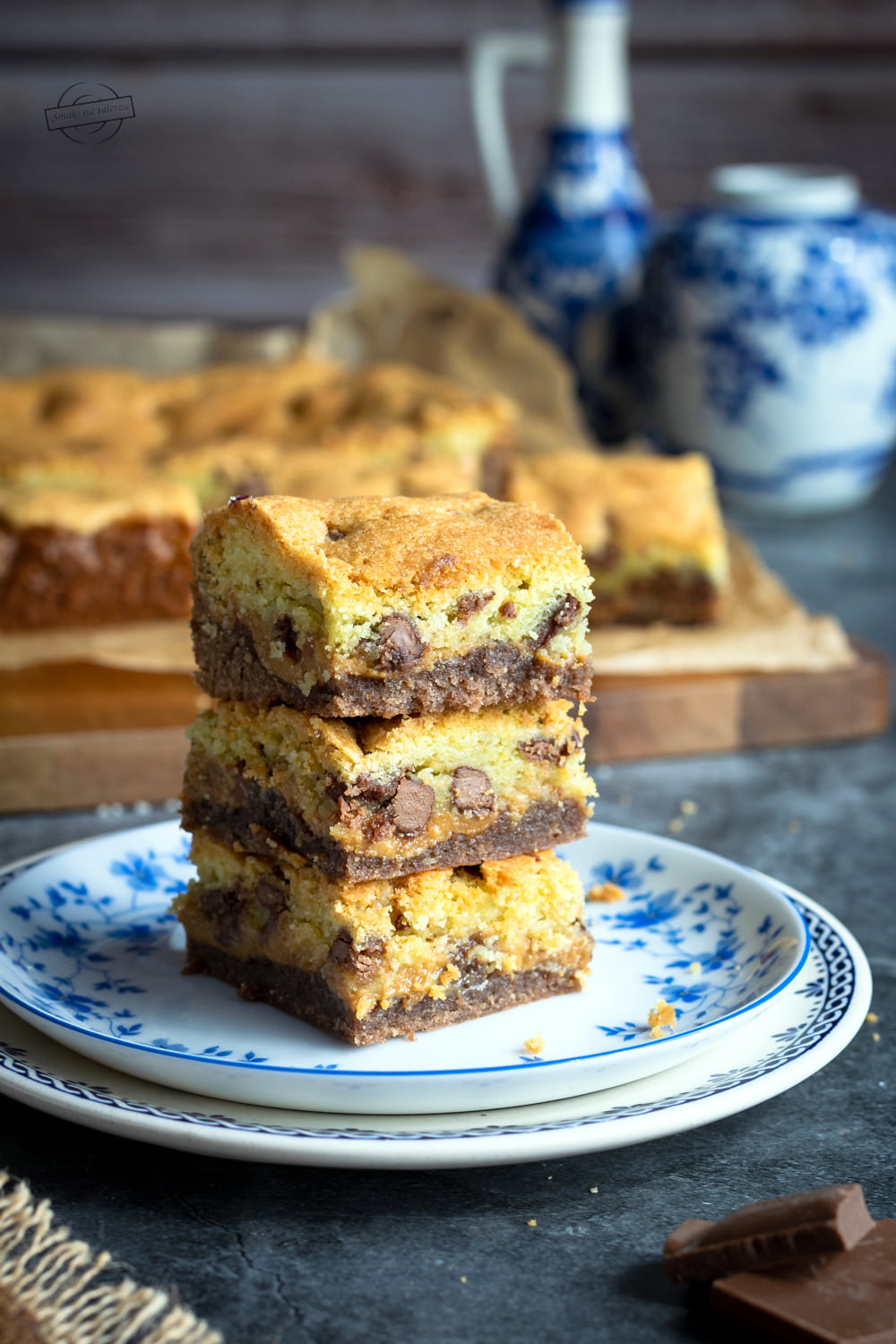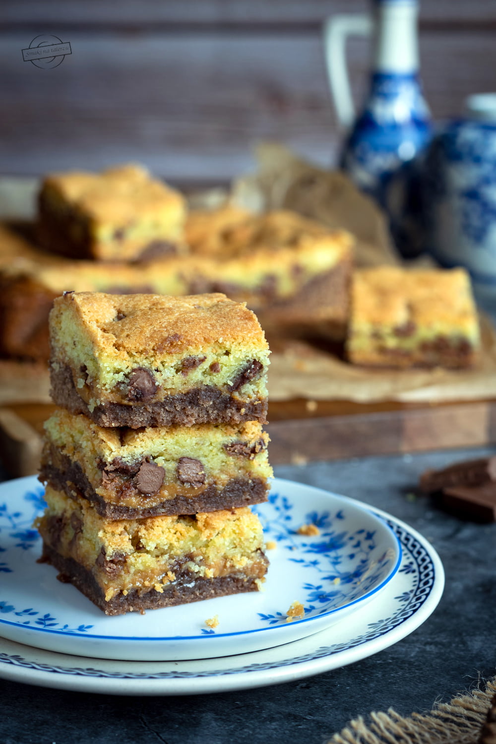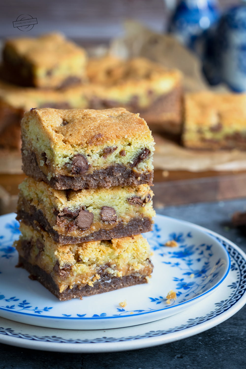 To takie brownie przygotowane na ciemnym kakao z kajmakiem i „ciasteczkową” masą. Do warstwy jasnego ciasta dodajemy kawałki posiekanej czekolady. Cudownie jest na nie trafić, ale uwaga, nie warto przesadzać z ich ilością. Przetestowałam to na własnej skórze, że przy zbyt dużej ilości czekolady, ciasto jest po prostu zbyt słodkie.