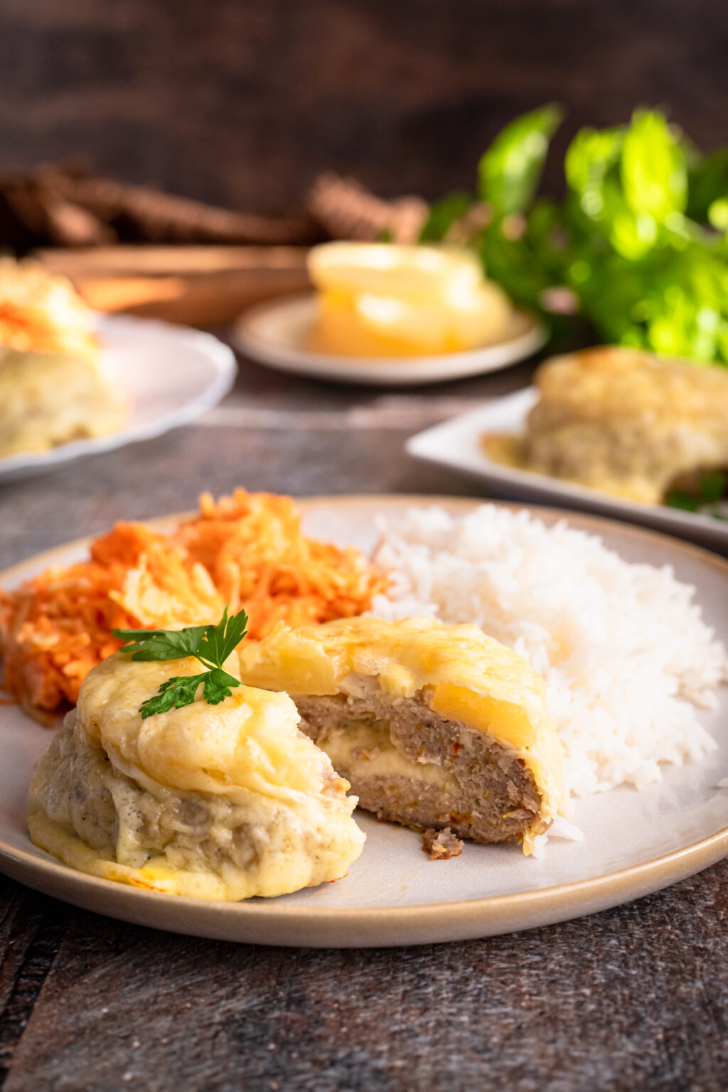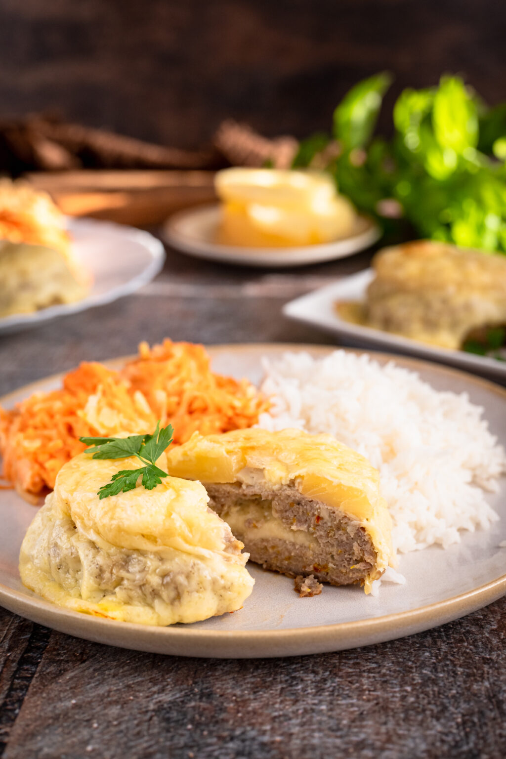 Pieczenie w piekarniku sprawia, że kotlety są zdrowsze niż smażone, a dodatek majonezu i przypraw nadaje im wyjątkowej delikatności. Ser w środku przyjemnie się rozpływa, a plaster ananasa na wierzchu w połączeniu z goudą tworzy smak, który jest świetnym dopełnieniem całości.