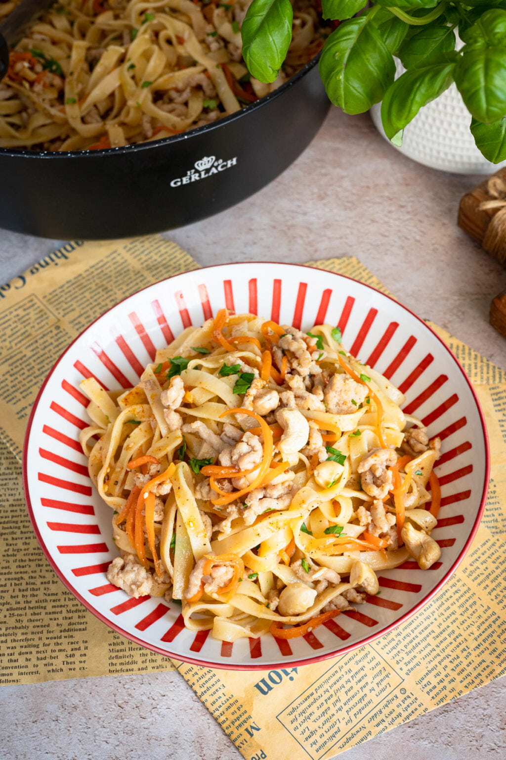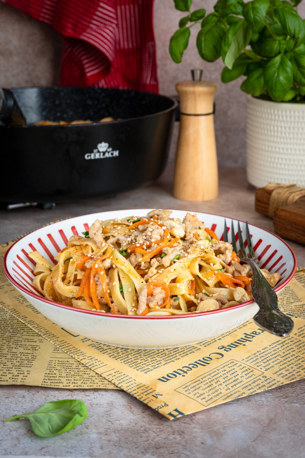 Warto dać mięsu chwilę spokoju na patelni, żeby dobrze się przyrumieniło, bo to właśnie ten etap buduje głębię smaku. Dopiero potem dodajemy warzywa i sos, który dzięki miodowi lekko się karmelizuje i pięknie otula makaron. Oprócz marchewki, możesz dodać trochę cukinii lub czerwonej papryki. Na co masz ochotę.