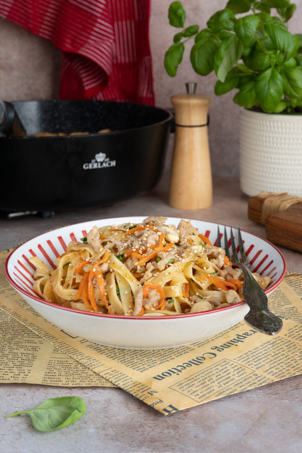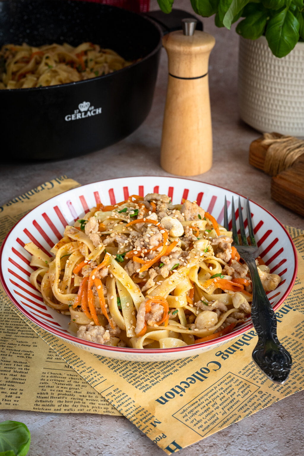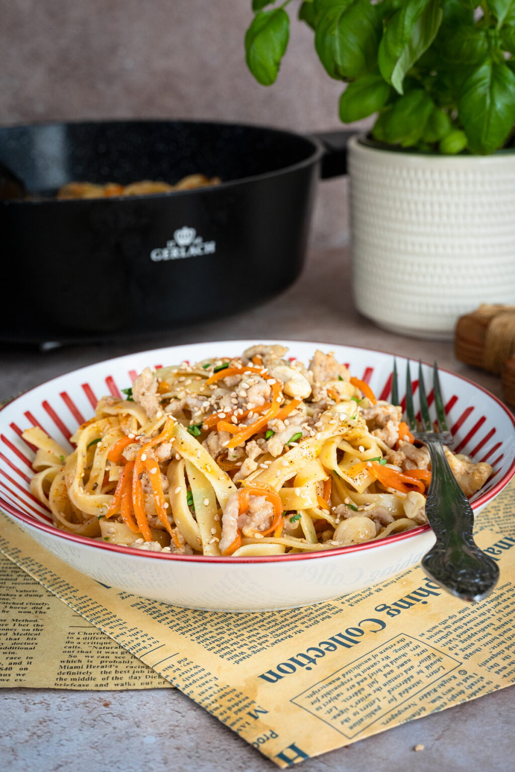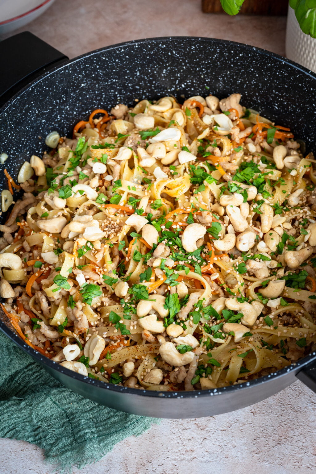 Na koniec odrobina wody z gotowania makaronu, która sprawia, że sos staje się jedwabisty i łączy wszystkie składniki w spójną całość. Posypany szczypiorkiem, sezamem i prażonymi nerkowcami makaron zyskuje nie tylko smak, ale i przyjemną chrupkość. Szybko, prosto i naprawdę bardzo smacznie. To idealny obiad na co dzień. Polecam.