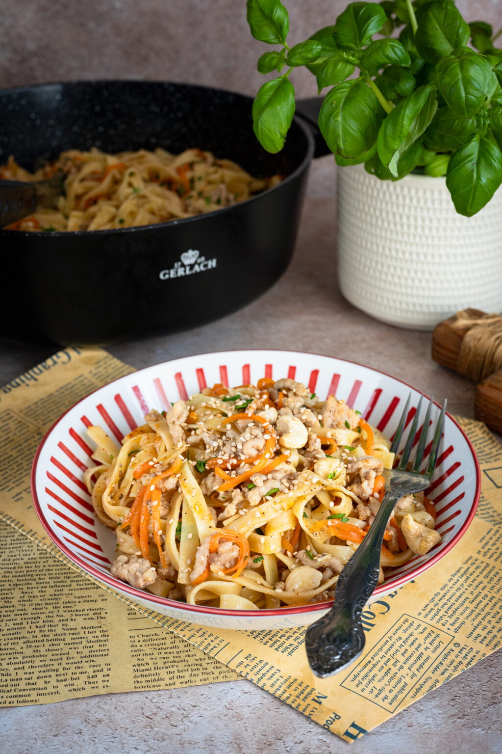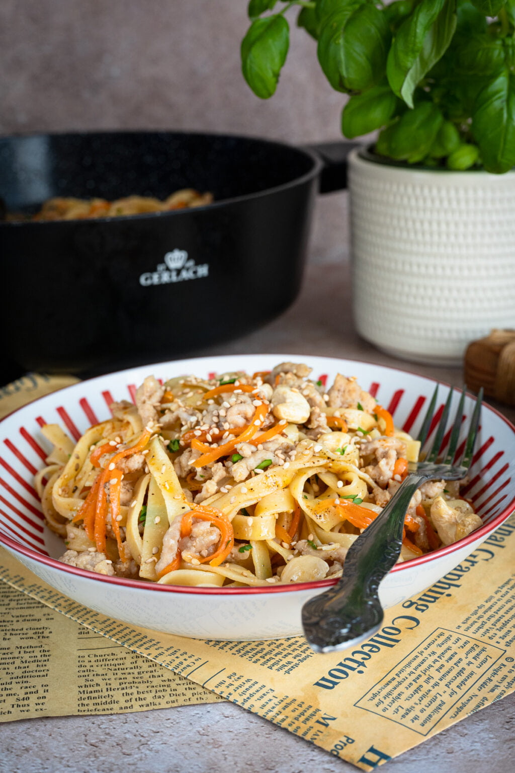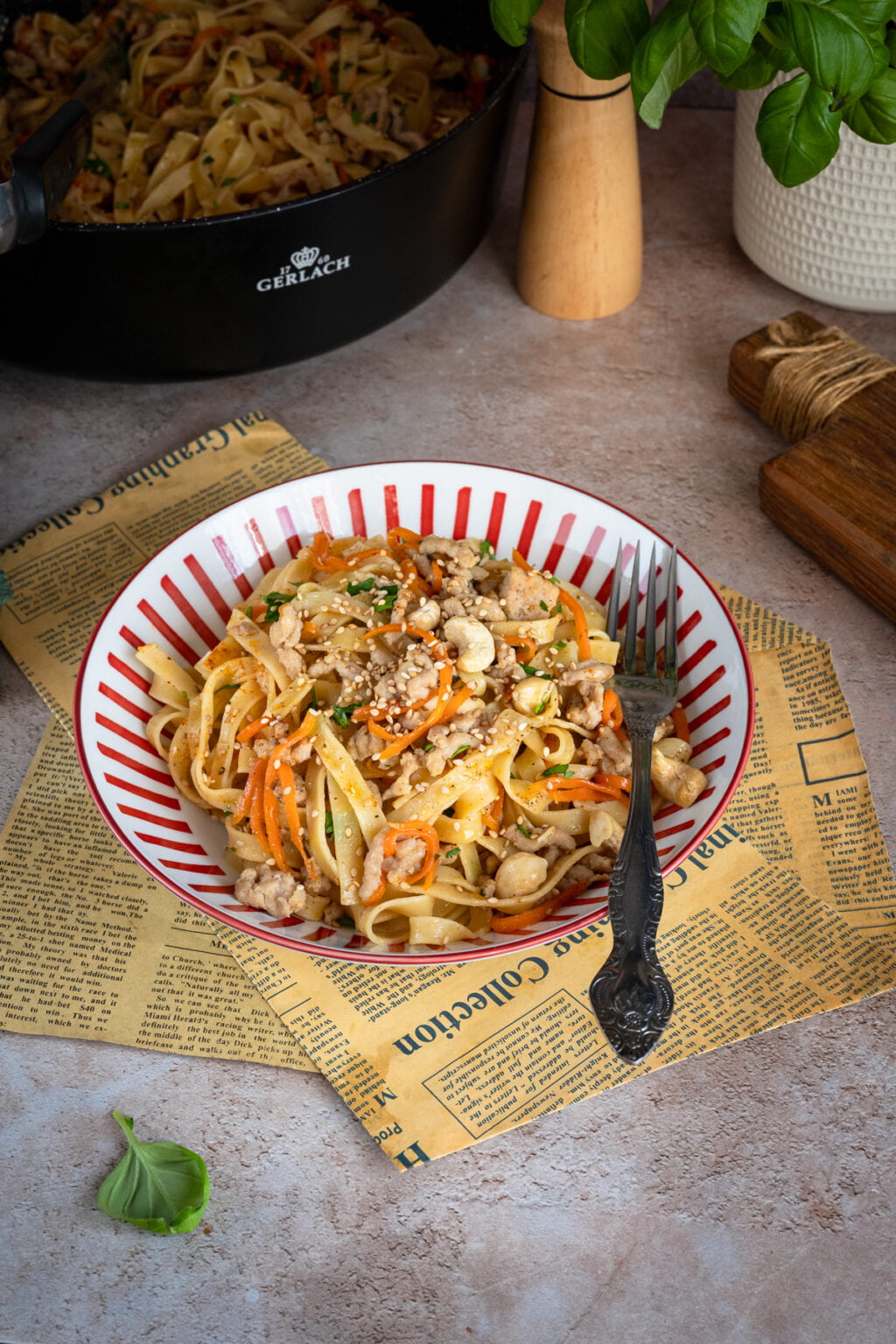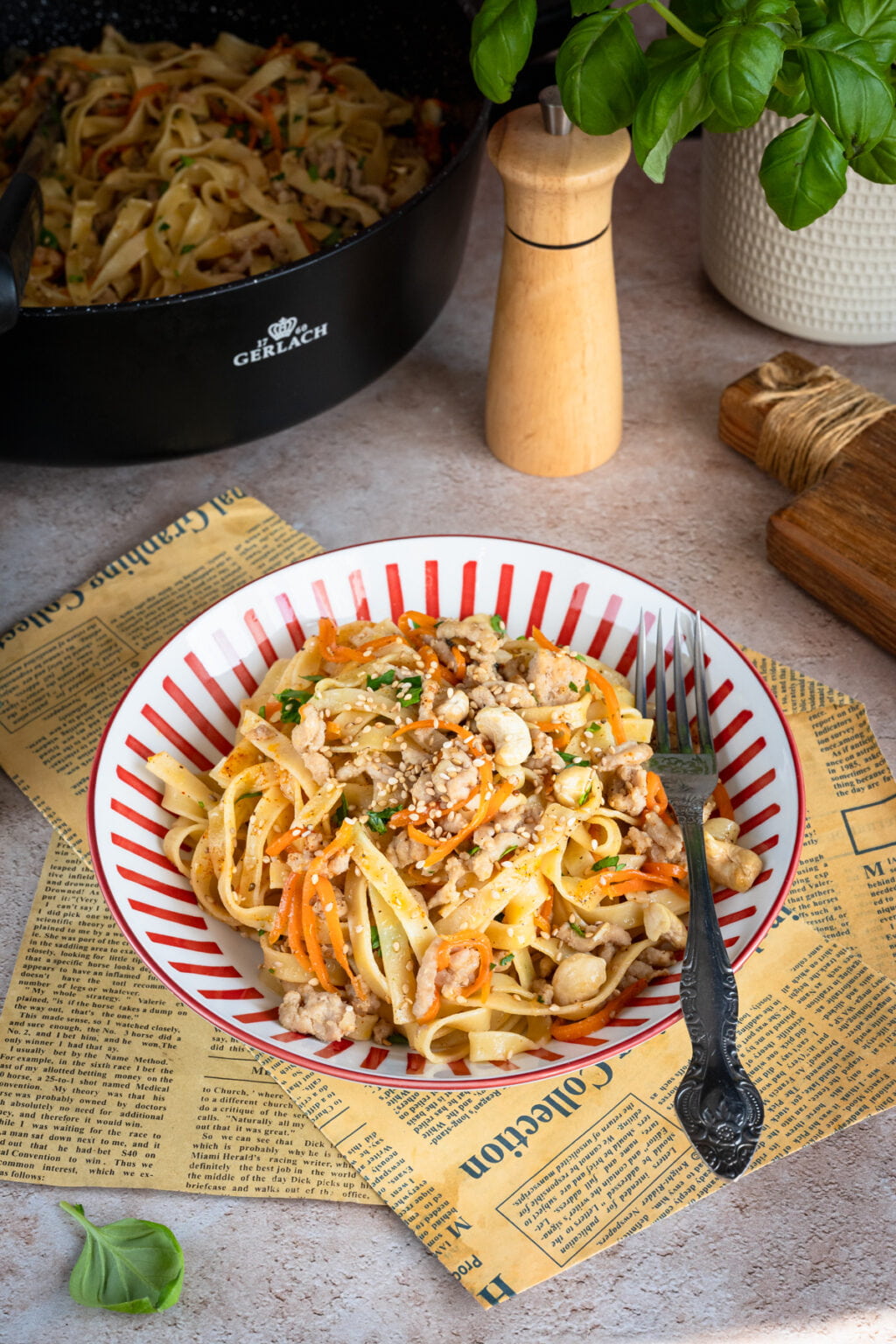 Na koniec odrobina wody z gotowania makaronu, która sprawia, że sos staje się jedwabisty i łączy wszystkie składniki w spójną całość. Posypany szczypiorkiem, sezamem i prażonymi nerkowcami makaron zyskuje nie tylko smak, ale i przyjemną chrupkość. Szybko, prosto i naprawdę bardzo smacznie. To idealny obiad na co dzień. Polecam.