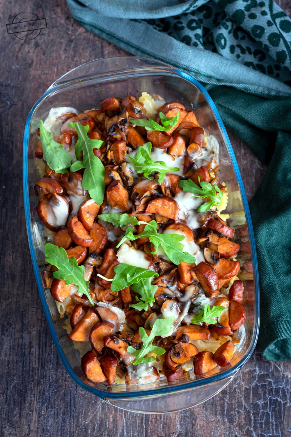 Zapiekanka makaronowa z kiełbasą, pieczarkami i gorgonzolą