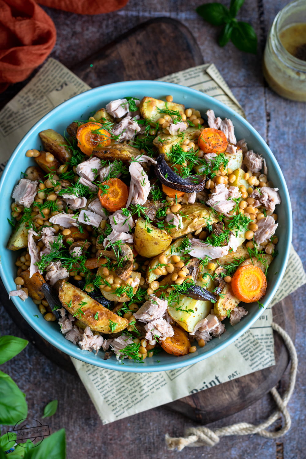 Sałatka z pieczonych warzyw z tuńczykiem i soczewicą